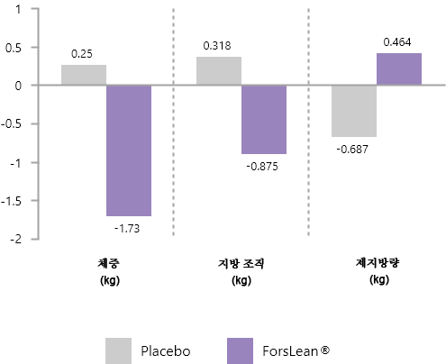 ForsLean®의 효과는 이중 맹검 임상 시험에서 확인되었으며, ForsLean®을 250mg 용량으로 12주 동안 복용한 후 피험자들은 위약을 받은 그룹에 비해 체중과 지방 함량이 크게 감소하고 제지방량이 크게 증가하는 것을 관찰했습니다.